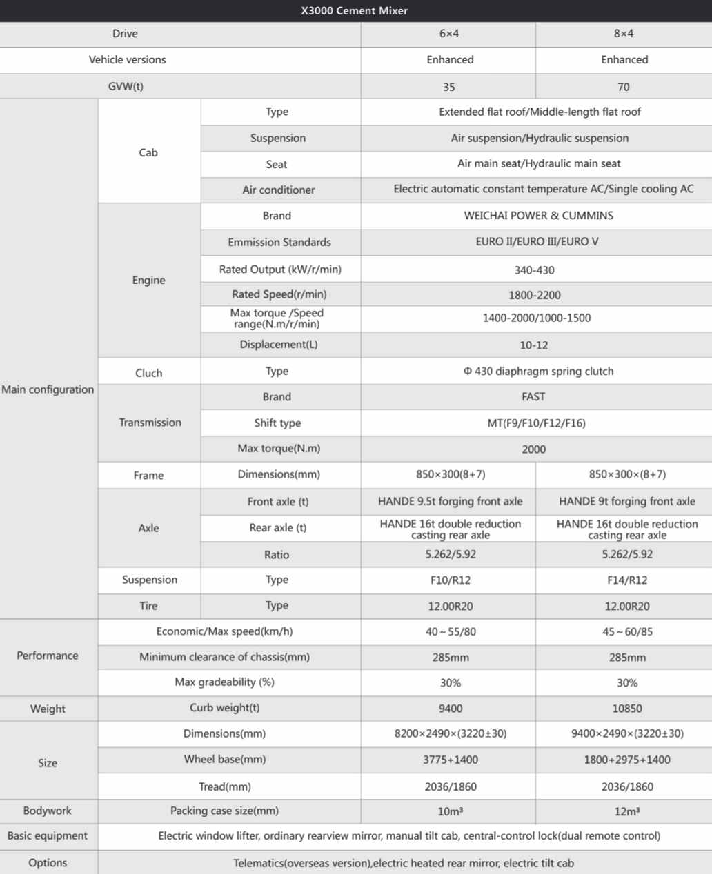تلعب شاحنة SHACMAN F3000 6x4 و 8X4 Cement Druck دورًا رئيسيًا في النقل الخرساني في صناعة البناء ، وتضمن نقل الخرسانة الفعال وضمان الجودة بحكم أدائها الموثوق به وقوتها القوية ووظيفة الخلط الممتازة. تتبنى هذه الشاحنة هيكل سلسلة F3000 لسيارات Shaanxi ، والتي لها صفيحة معدنية صلبة وقدرة تحميل قوية. يجعل تصميم "رأسه المسطح" سهلاً للدخول والخروج من المدينة ، وتجنب مشكلة أعمدة تقييد الارتفاع. تم تجهيز الكابينة بأكياس الهواء ومقاعد ممتصة الصدمات لتعزيز تجربة القيادة. مصنوعة من الخزانات والشفرات المثبتة من أعلى من الصلب والمواد المقاومة للارتداء ، مما يحسن إلى حد كبير عمر الخزان.